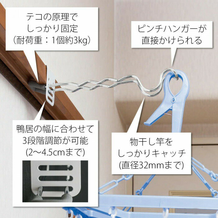 ※取り付け可能な鴨居の幅は2〜4.5cmです 生産国中国商品説明簡単に取り付けできる室内物干し掛けにロングサイズが登場! ネジ・釘・工具不要で鴨居や扉枠などにワンタッチで付け外しができます。