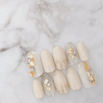 ネイルチップ つけ爪 デザイン かわいい ショート ロング シンプル 成人式 nail プレゼント 母 短い爪 小さい爪 大きい爪 ベリーショート ちび爪 結婚式 ウェディング 付け爪 ジェルネイル●アイボリークラッシュシェルストーンゴールド囲みネイル a/n