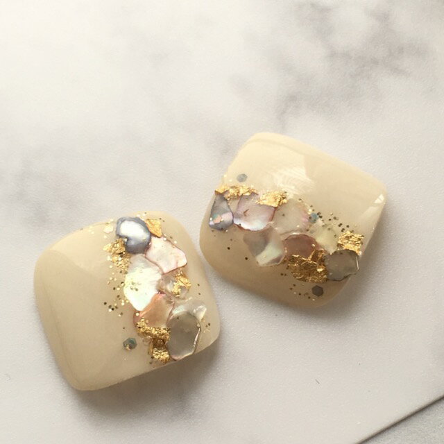 フットネイル ネイルチップ ペディチップ 足用チップ 親指2枚選べるサイズでぴったりネイルジェルネイルでサロン風仕上がり!マリンやビーチで夏ネイル☆浴衣やにもどうぞ☆●アイボリーシェルクラッシュストーンゴールド〈商品番号1566〉 a/n