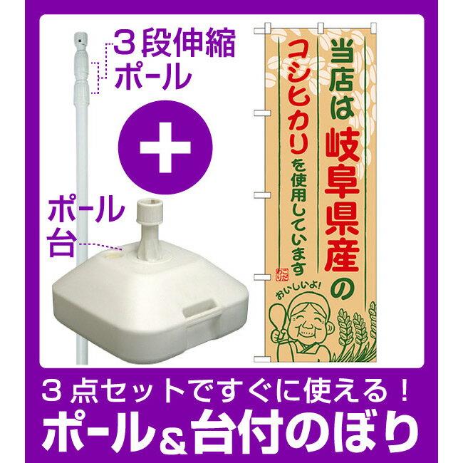 【3点セット】のぼりポール(竿)と立て台(16L)付ですぐに使えるご当地のぼり旗 岐阜県産 内容:コシヒカリ (SNB-912) (お弁当・お惣菜・おにぎり/お米)