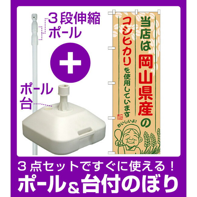 【3点セット】のぼりポール(竿)と立て台(16L)付ですぐに使えるご当地のぼり旗 岡山県産 内容:コシヒカリ (SNB-928) (お弁当・お惣菜・おにぎり/お米)